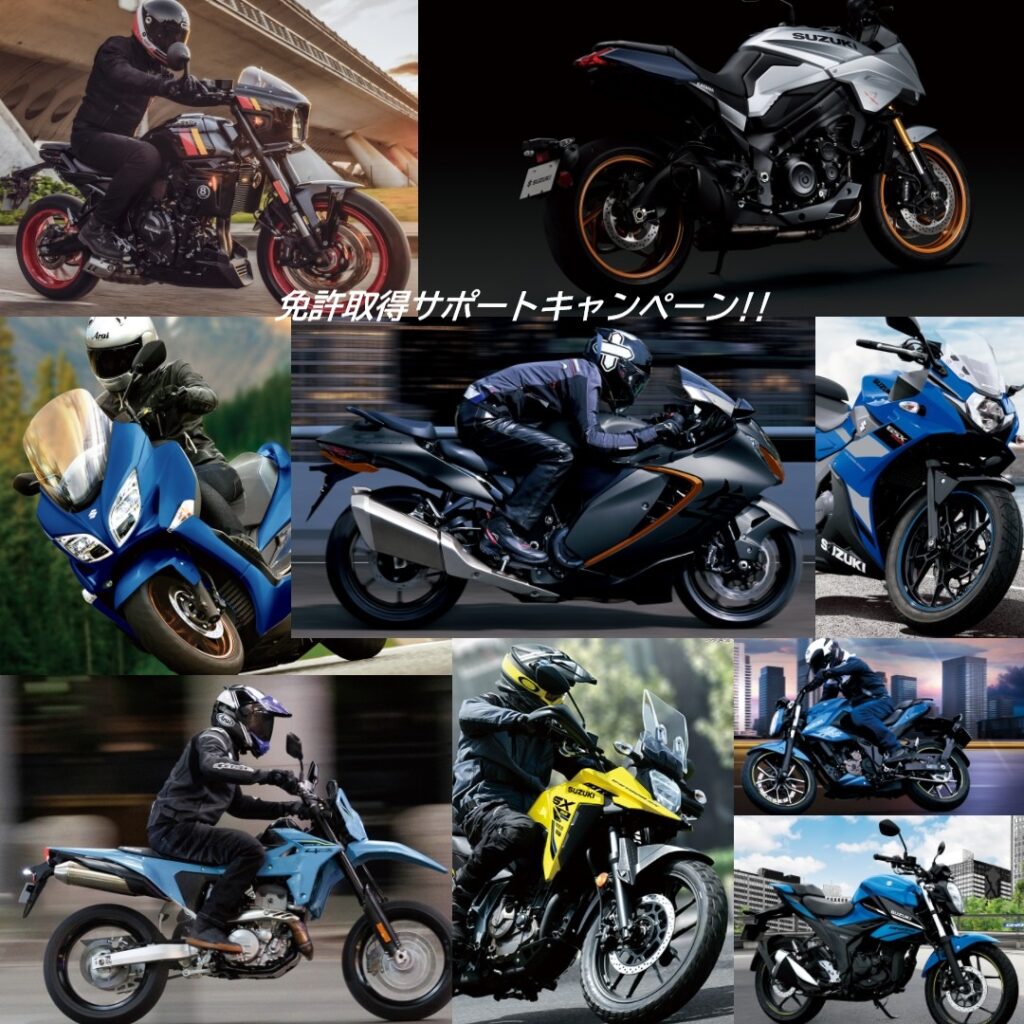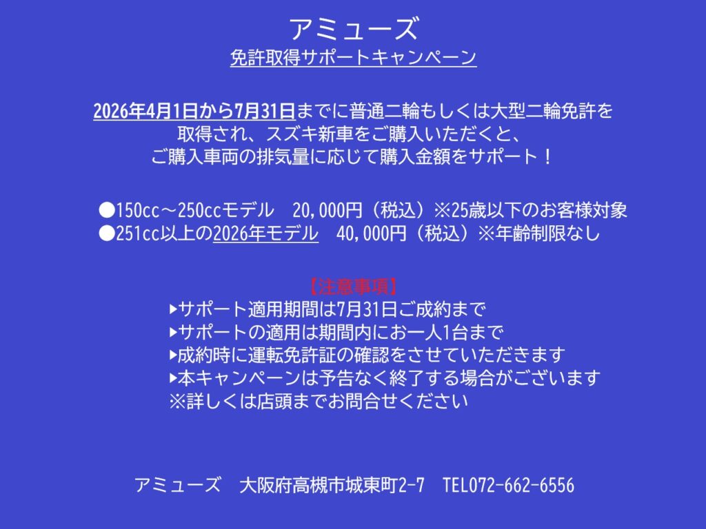 ・2026年4月1日~7月31日までに普通二輪もしくは大型二輪免許を取得され、スズキが国内正規販売する新車をご購入いただきますと、ご購入車両に応じて購入金額をサポートさせていただきます!
